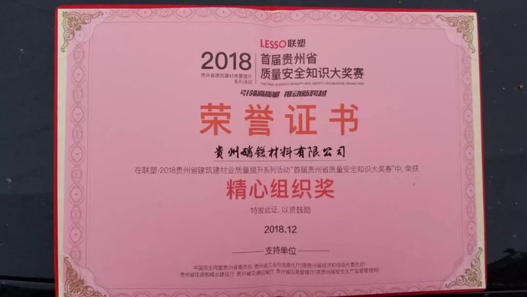 12月21日,建设集团磷镁公司在2018首届贵州省质量安全知识大奖赛决赛中,荣获组委会颁发的“精心组织奖”。